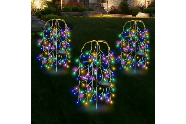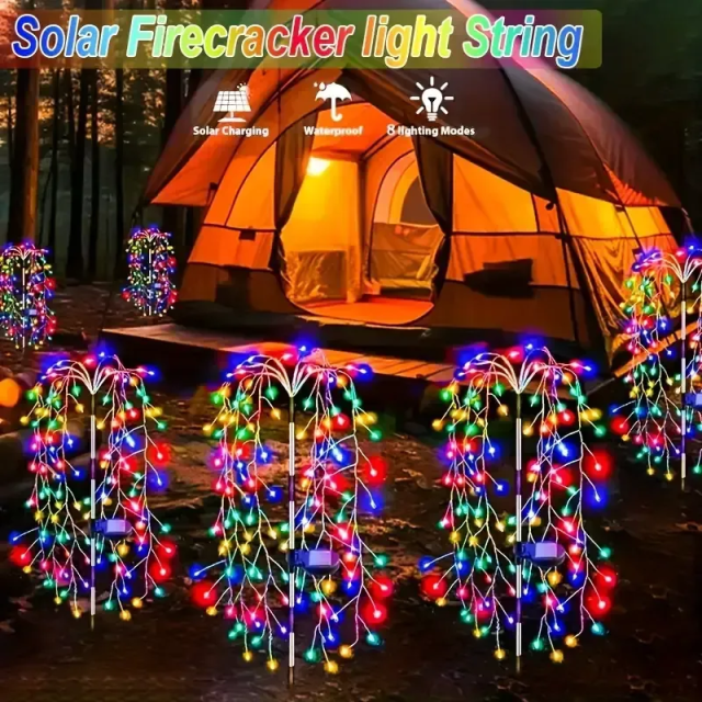 Гнучкі мідні дроти з безліччю LED дозволяють створювати унікальні форми — від «феєрверків» до абстракцій. Світильники автоматично заряджаються вдень і вмикаються з настанням темряви, створюючи яскраву святкову атмосферу.