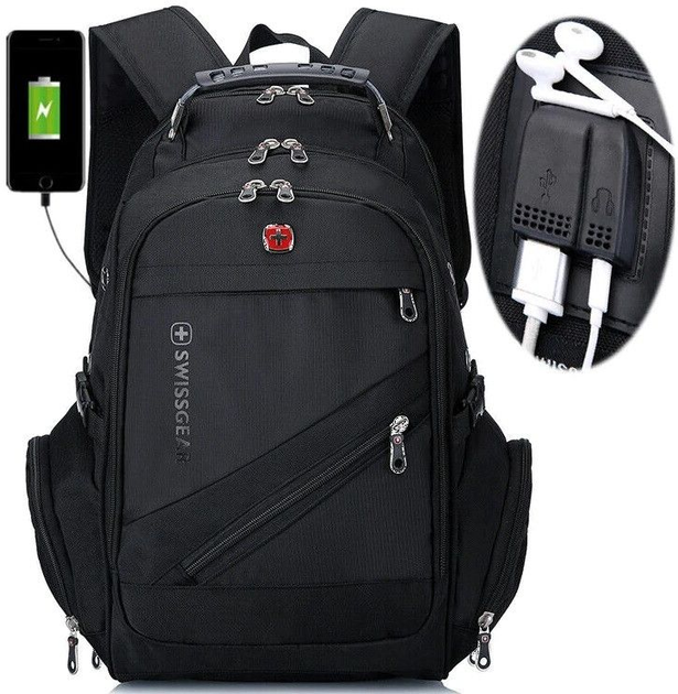 Рюкзак Swissgear 8810 35 л чоловічий міський / туристичний з відділенням для ноутбука 17" Відмінно справляється з покладеними на нього завданнями, його можна використовувати як міського, так і туристичного рюкзака. Велика кількість продуманих відділень і висока якість виконання роблять його лідером рюкзаків об'ємом 39 літрів (стандарт, міський). Особливості: Ортопедична система комфорту спини Airflow забезпечує циркуляцію повітря для максимальної зручності Армована сталевим тросом ручка Заглушки від дощу на блискавках Спеціальна внутрішня кишеня для МР3 плеєра Аудіопорт Відділ для ноутбука має спеціальний захист і ущільнену м'яку стінку Водовідштовхувальний матеріал Утяжки з фастексами на боках ранця Забезпечений компресійними стяжками кишеня для плеєра мобільного телефону Вбудований у рюкзак подовжувач для навушників дозволить слухати музику з плеєра, планшета чи ноутбука, що лежать у рюкзаку. Один кінець подовжувача вставляється в джерело звуку в рюкзаку, а навушники підключаються до гнізда, розташованого на лямці рюкзака. Ортопедична спинка та лямки рюкзака, для зручності при тривалому носінні (дизайн задньої м'якої вставки рюкзака забезпечує циркуляцію повітря AirFlow для комфорту та максимальної зручності для спини.) Swissgear 8810 відрізняється високою якістю виконання, його міцна тканина із суміші нейлону промокає і витримує всі тяготи вуличного життя. Фурнітура зроблена якісно. Оптимальний обсяг рюкзака дозволять покласти в нього все необхідне для продуктивної роботи: ноутбук, документи, змінний одяг, їжу; все, що завгодно. Усередині є кілька відділень для розподілу ручок, телефону та іншої дрібниці. Габарити: Розмір: 330 х 230 х 450 мм Об'єм: 39 л Вага: 1,1 кг