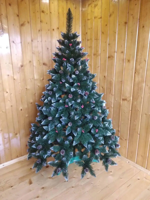 Розкішна пухнаста ялинка натурального зеленого кольору з натуральними шишками та сніжно-білим напиленням на гілочках і ягодах, має надзвичайно гарний і святковий вигляд. Така штучна ялинка стане справжньою окрасою Вашого свята на довгі-довгі роки.