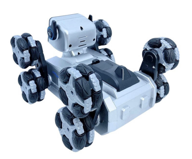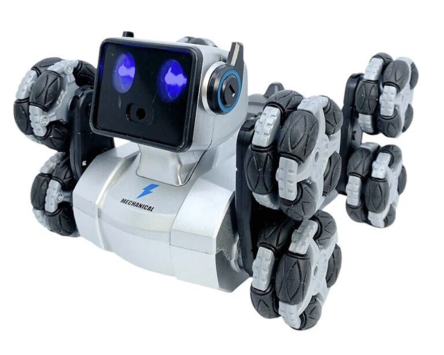 Ця восьмиколісна собака-робот вміє виконувати трюки та рухатися в різних напрямках по команді з пульта, а також обладнана яскравими світлодіодними індикаторами, вбудованою музикою, класною підсвіткою, 8 колесами Mecanum, частотою бездротового дистанційного керування 2,4 ГГц, демонстрацією однією кнопкою й інноваційним дизайном. Вона може повертатися, їхати вперед і назад, розвертатися на місці, відкриваючи безліч варіантів для гри.