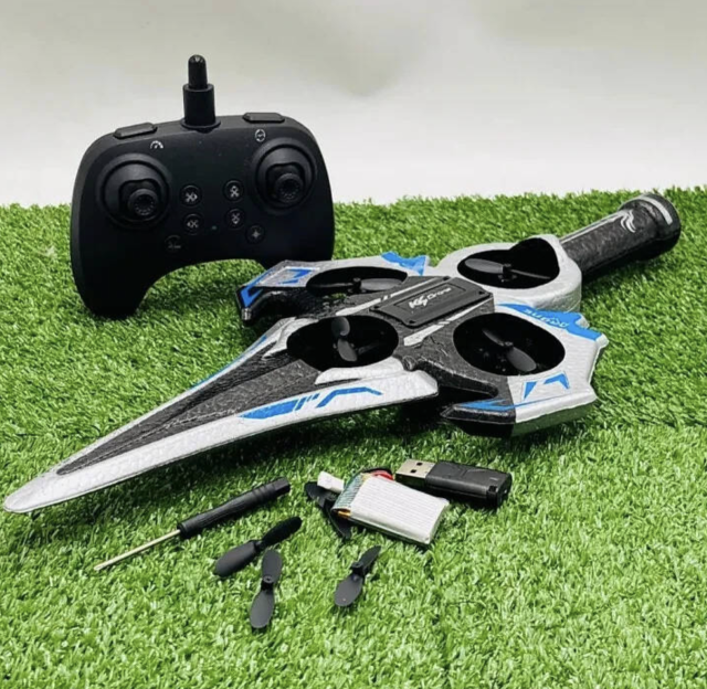 Дистанційний літальний меч Drone KS-199 являє собою інноваційний дрон-смоліт, який поєднує функції літака та трюкового дрона. Пристрій обладнаний чотирма двигунами та можливістю виконувати трюки на 360°, що робить польоту ефектними та цікавими для дітей, підлітків і дорослих.