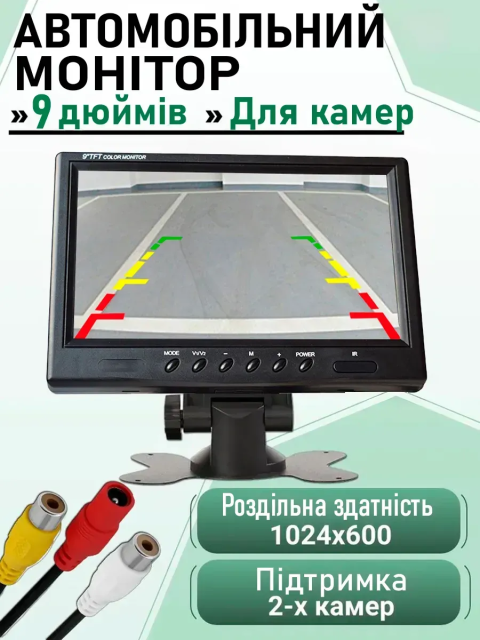 Автомобільний монітор 9" з двома відеовходами, пультом ДУ та автоматичним перемиканням на камеру заднього виду