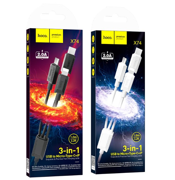 Кабель Hoco X74 3-in-1 charging cable (iP+Micro+Type-C) Black – це універсальне рішення для заряджання різних пристроїв, оснащених роз'ємами...
