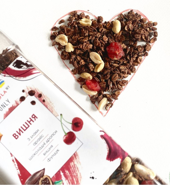 3 злаки, арахіс, шоколадні дропси, вишня, фундук
