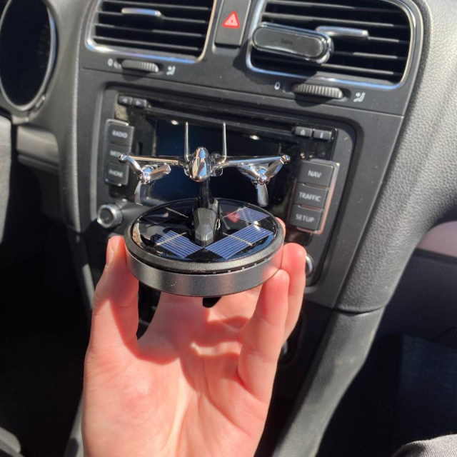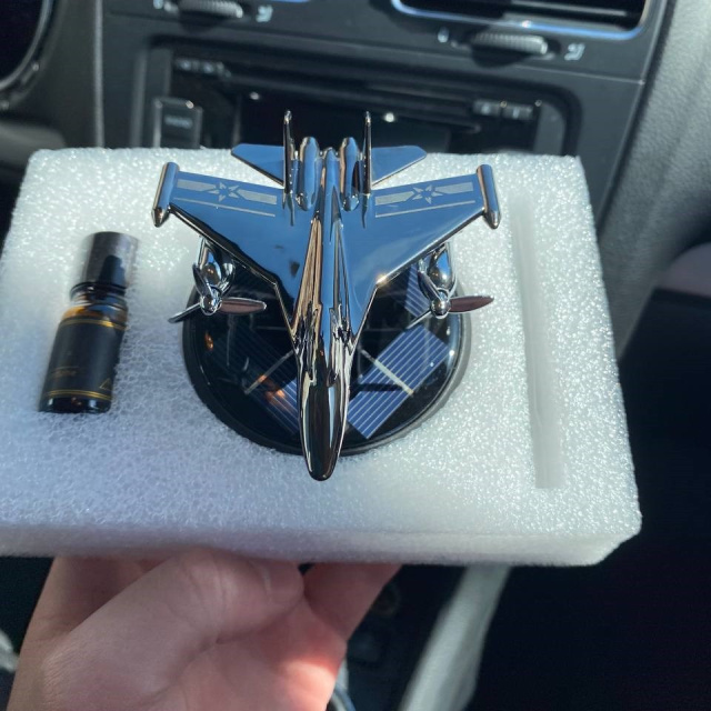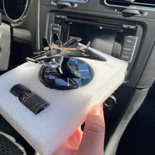 Ароматизатор "Самолеток-истребитель" имеет встроенную солнечную панель. Когда светит солнце, пропеллеры самолетики автоматически начинают вращаться, обеспечивая эффективное распространение аромата по всему салону вашего автомобиля. Это не только инновационное решение, но и экологически чистый способ создать атмосферу уюта и свежести.