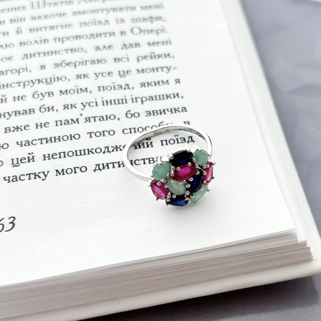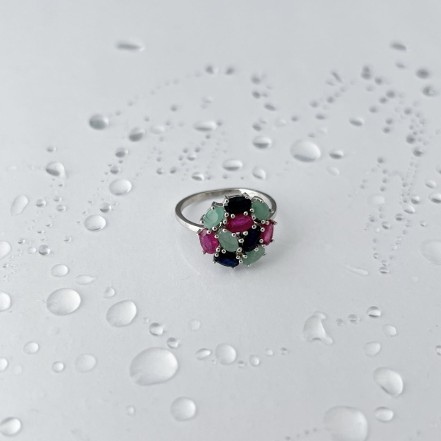 Родированное серебряное кольцо 925 пробы с натуральным сапфиром 2.938ct, изумрудом, рубином. Родированные украшения дольше сохраняют свое первоначальное состояние, а именно цвет и блеск металла. Все ювелирные изделия представленные на нашем сайте прошли внутренний контроль качества, а также контроль государственной пробирной службой Украины, на всех изделиях стоит соответствующая проба. К каждому ювелирному украшению прилагаются бирка с указанием всех параметров.*Цвета изделий на сайте могут незначительно отличаться от реальных из-за особенностей цветопередачи экрана