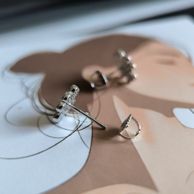 Родированые серебряные серьги 925 пробы с фианитами. Родированные украшения дольше сохраняют свое первоначальное состояние, а именно цвет и блеск металла. Все ювелирные изделия представленные на нашем сайте прошли внутренний контроль качества, а также контроль государственной пробирной службой Украины, на всех изделиях стоит соответствующая проба. К каждому ювелирному украшению прилагаются бирка с указанием всех параметров.*Цвета изделий на сайте могут незначительно отличаться от реальных из-за особенностей цветопередачи экрана