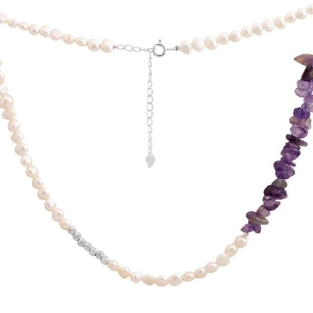 Родированное серебряное колье 925 пробы с натуральным жемчугом барочным, аметистом. Родированные украшения дольше сохраняют свое первоначальное...
