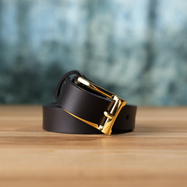 Стримана прямокутна механічна пряжка кольору під жовте золото додає ременя вишуканості та підкреслює жіночність, а тиснений логотип бренду є акцентом на оригінальність та преміальну якість виробу.