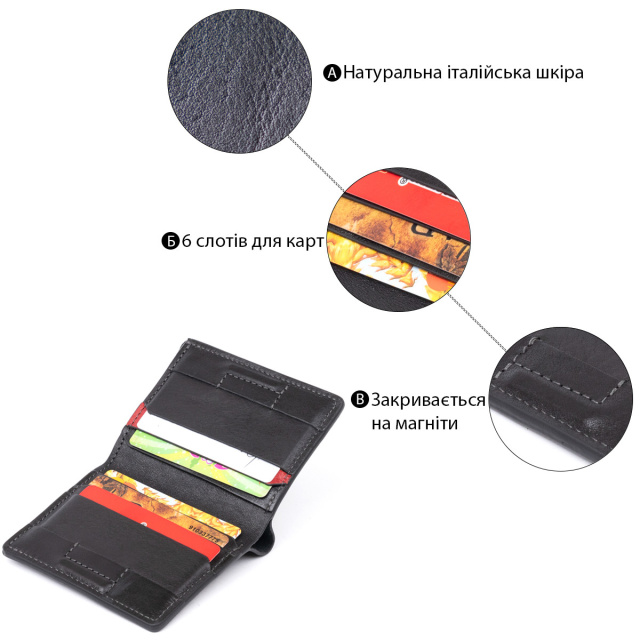 Стильне портмоне-кредитниця комбі в гладкій шкірі 711327 Чорне, Київ