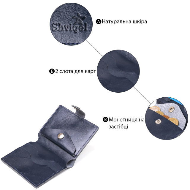 - монетниця на кнопці. Відмінне портмоне невеликого розміру у темно-синьому кольорі з легким переливом. Виконаний аксесуар з натуральної шкіри високої якості та відмінними характеристиками. Має просторе відділення на всю довжину для купюр, кишеньки для візитних та кредитних карток, а також монетницю на кнопці, що дуже зручно та практично. Ця модель закривається за допомогою шкіряного хлястика з кнопкою. ОПЛАТА та ДОСТАВКА : накладний платіж з передоплатою 200 грн.Терміни відправлення : 1-3 робочих днів