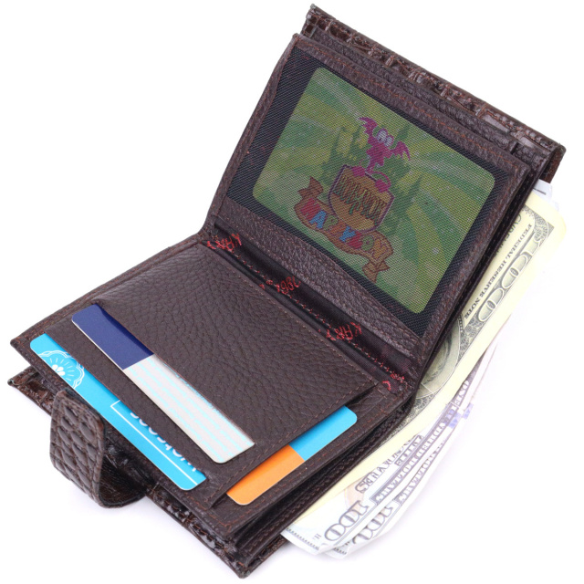 - виріб упакований у фірмову коробку. Тонкий компактний портмоне з натуральної шкіри з тисненням під крокодила, що закривається хлястиком на кнопку. Виріб має велику кишеню для купюр. Усередині достатньо осередків для кредиток. Виріб продуманий для сучасної людини. Виріб має насичений коричневий колір. Оригінальний аксесуар вигідно виділить вас із натовпу. Гаманець стане чудовим подарунком для Ваших близьких. ОПЛАТА та ДОСТАВКА : накладний платіж з передоплатою 200 грн.Терміни відправлення : 1-3 робочих днів