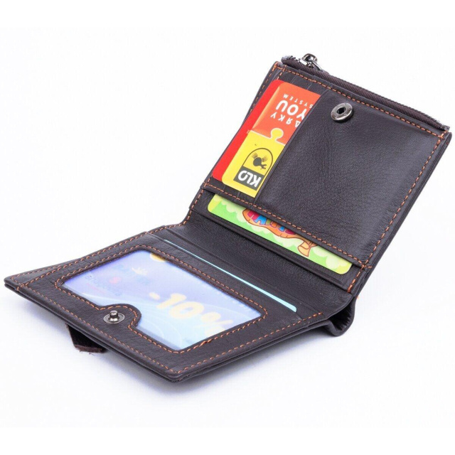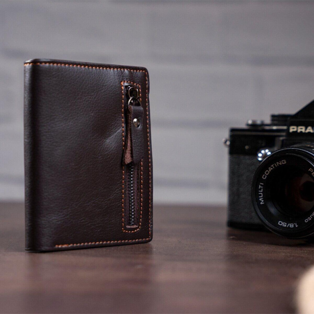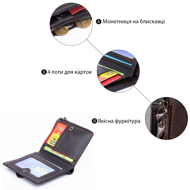 - всередині текстильна підкладка коричневого кольору. Аксесуар прошитий по краях світло коричневою ниткою. Модель невеликого розміру і поміститься в кишеню або сумку. Гаманець виконаний з натуральної шкіри високої якості. Фурнітура в гаманці кольору темного срібла. Модель має найнеобхідніший функціонал для будь-якої людини. Виробництво фабричний Китай високої якості. Аксесуар упакований в пилозахисний чохол. Якщо ви вирішите вибрати такий аксесуар на подарунок для близької людини точно не помилитеся.