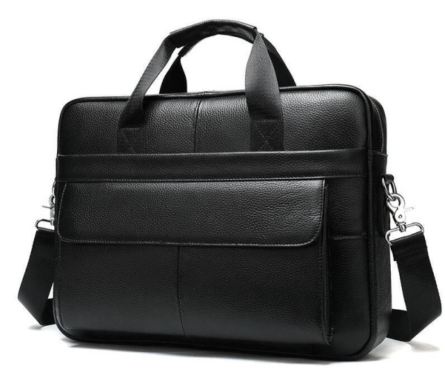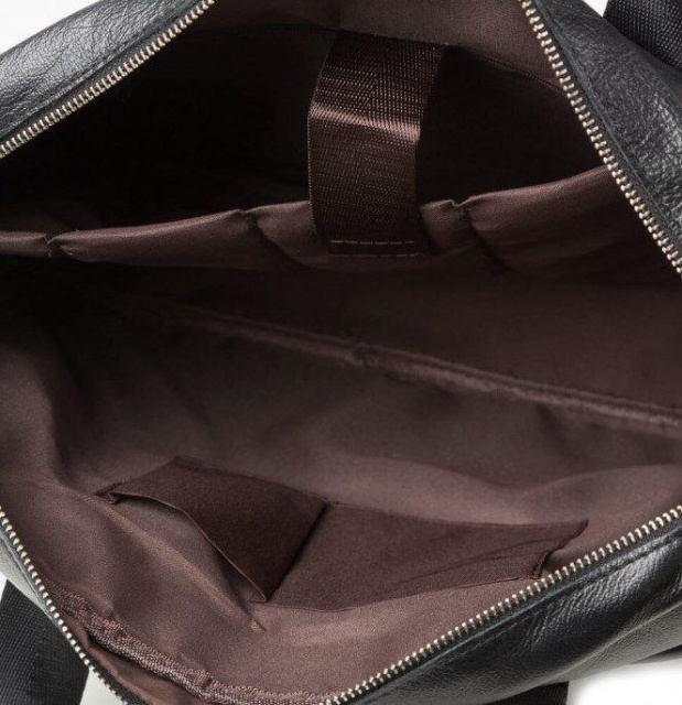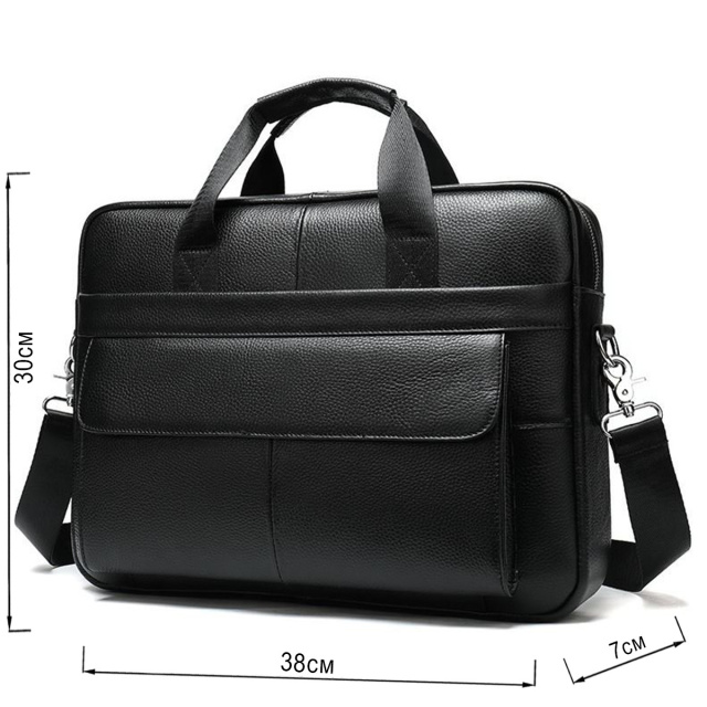 Розміри (ШхВхГ, см): 38х30х7. Вмістка чоловіча сумка з відділенням для невеликого ноутбука 15 дюймів, а також документів формату А4. Аксесуар виконаний з натуральної зернистої шкіри чорного кольору. На лицевій стороні даного виробу розташовані два вмістких відділення, одне під клапаном на магнітах, інше на блискавці. На задній зовнішній стороні знаходиться ще одне відділення на блискавці. Сумку можна переносити в руці за допомогою зручних шкіряно-текстильних ручок, а також через плече (в комплекті є регульований плечовий ремінь, який виконаний з текстильного матеріалу). Колір фурнітури: срібло. Всередині: