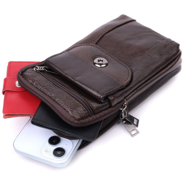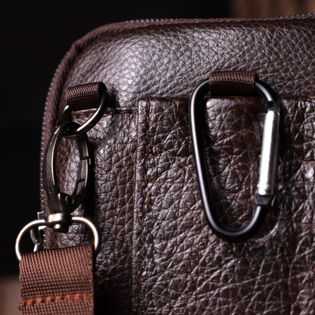 - знімний текстильний ремінець. Невелика вертикальна шкіряна сумка, яка з легкістю зможе замінити Вам барсетку. Особливістю сумки є те, що ви можете носити її, повісивши на свій ремінь за петельку на тильній стороні сумки або закріпити її на карабін, а також на плечі, для цього передбачений знімний ремінець. Маленька сумка - дуже практичний варіант для водіїв, мандрівників, а також для практичних чоловіків, які люблять, щоб усе було під рукою. Прослужить модель Вам не один рік. У комплекті до виробу йде пилозахисний чохол.