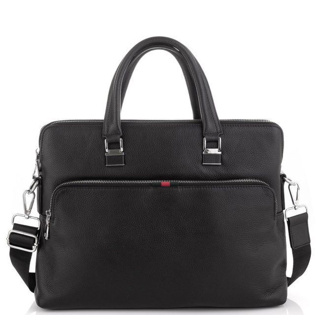 Стильна сумка для ноутбука 717621A виготовлена з натуральної шкіри чорного кольору і має зернисту структуру.