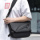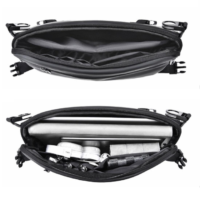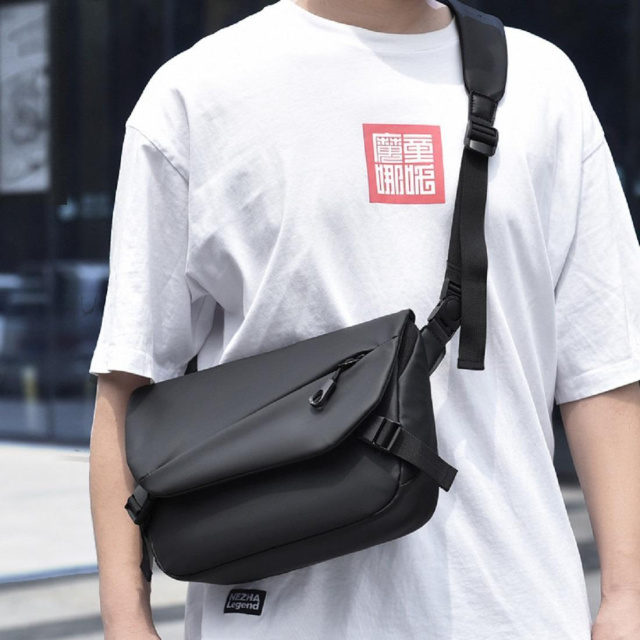 Сумка через плече в горизонтальному форматі пошита з міцного текстилю, з вологостійким просоченням, у чорному кольорі.