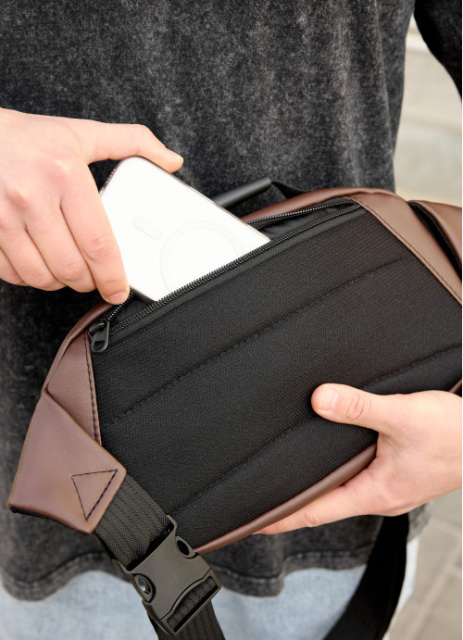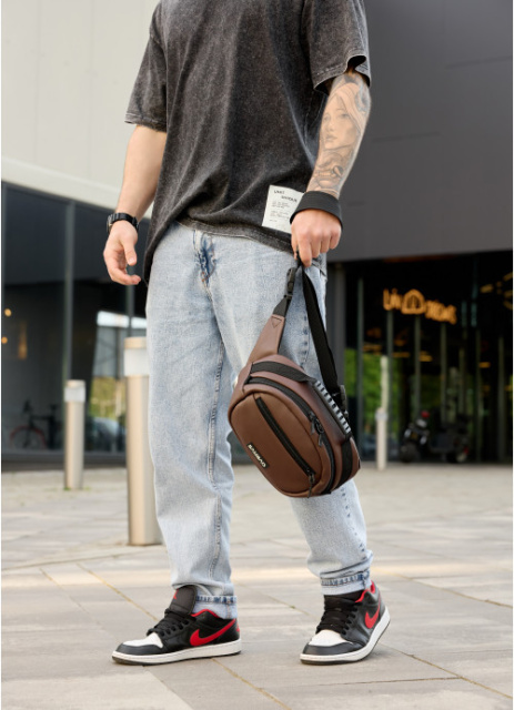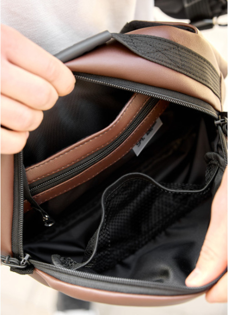 ззовні спереду сумки одна кишеня. Всередині сумки окреме одне основне відділення, кишеня на блискавці, відкрита кишеня та кишеня з сітки. Додатково має карабін для ключів. Ззовні на спинці сумки одна кишеня на блискавці. Спинка - вентиляційна, виконана з Air Mesh 3D. Стандартно поставляється на обхват по талії (через плече) від 86 см до 160 см: ремінь регулюється. При замовленні в коментарі зазначте необхідну довжину ременя, якщо вона відрізняється від стандартної.