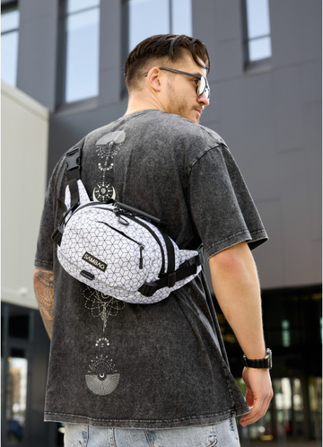 ззовні спереду сумки одна об'ємна кишеня на блискавці. Всередині сумки — окреме основне відділення, кишеня на блискавці, відкрита кишеня та кишеня з сітки. Додатково має карабін для ключів. Ззовні на спинці сумки одна кишеня на блискавці. Спинка - вентиляційна, виконана з Air Mesh 3D. З боків додаткові регулятори об'єму бананки. Стандартно поставляється на обхват по талії (через плече) від 86 см до 160 см: ремінь регулюється. При замовленні в коментарі зазначте необхідну довжину ременя, якщо вона відрізняється від стандартної.