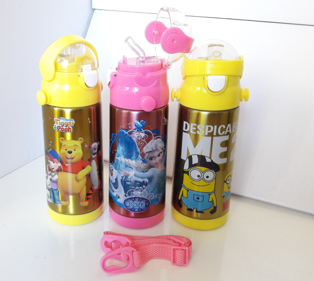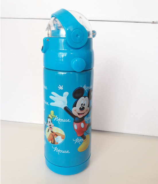 Термос из пищевой нержавейки на 350мл. Оборудован трубочкой поилкой с защитной крышкой и фиксатором с предохранителем. Так же в комплект входит наплечный ремешок.