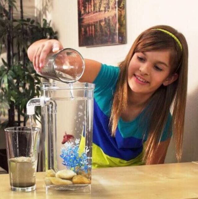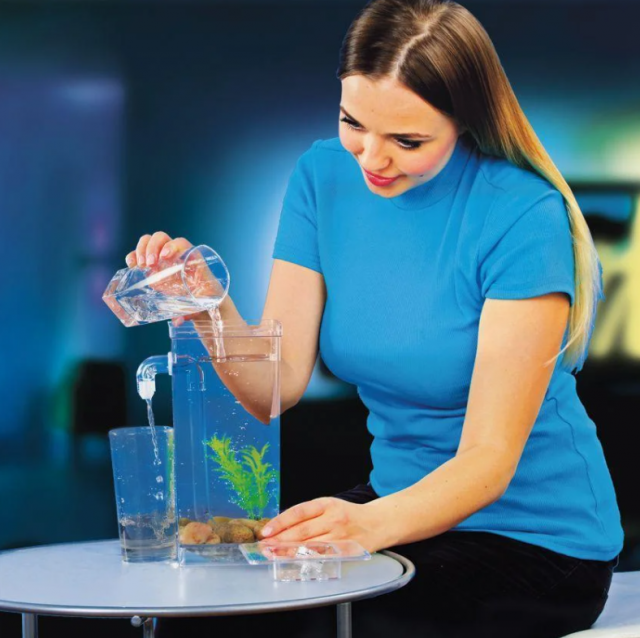 Вы хотите научить Вашего ребенка самостоятельности, ответственности и раздумываете какого домашнего питомца стоит для этого завести? Ведь именно домашние животные несомненно оказывают благотворное влияние на психическое и физическое развитие детей. Предложите Вашему ребенку в качестве первого опыта уход за рыбками. Рыбки – идеальные домашние питомцы, они не доставят вам много хлопот! Кроме того, аквариум, наполненный разноцветными рыбками, завораживает и доставляет удовольствие не только детям, но и взрослым. Ведь наблюдение за аквариумными рыбками приносит расслабление и успокоение. Для этого есть только один-единственный способ – купить аквариум My Fun Fish с системой самоочищения и окунуться в волны расслабляющей аквариумной терапии. Аквариум выполнен из прозрачного ударопрочного пластика, поэтому он безопасен для детей. В комплект входит все необходимое для его установки, в том числе камни на дно и одно растение. Вам остается только налить воды и запустить новых обитателей в аквариум. Система самоочищения очень проста: Вам просто нужно периодически доливать аквариум чистой водой. При этом, грязная вода со дна аквариума выливается через специальную трубку. Благодаря уникальной конструкции, система высасывает со дна аквариума излишки воды и все отходы. Вам не приходится систематически очищать стенки от налета из водорослей. Аквариум My Fun Fish оснащен светодиодной подсветкой, поэтому вам не придется самим искать для него источник освещения. Аквариум также может служить приятным успокаивающим ночником для детской спальни. Уход за рыбками доставит удовольствие не только детям, но и взрослым. Для людей с повышенной возбудимостью или испытывающим состояние постоянного стресса аквариум просто необходим как средство для релаксации – рыбки, словно немногословные друзья, способны выслушать все о Ваших проблемах и успокоить. Ежедневные несложные заботы – когда аквариум готов, рыбки в него выпущены и накормлены, довольны и здоровы — позволят избавиться от депрессии или расстройства. Останется только радость от присутствия рядом хоть и молчаливых, но таких милых существ. Уникальный аквариум My Fun Fish, который чистит себя сам, в качестве подарка будет по достоинству оценен Вашими детьми, друзьями и близкими! Возраст: от 8 лет Материал: ударопрочный пластик Объем: 2 л Питание для светодиодной подсветки: 2 батарейки CR2025 Размеры: 11х11х25 см Вес: 600 г аквариум с системой самоочистки My Fun Fish светодиодная подсветка камни на дно пластиковое водное растение