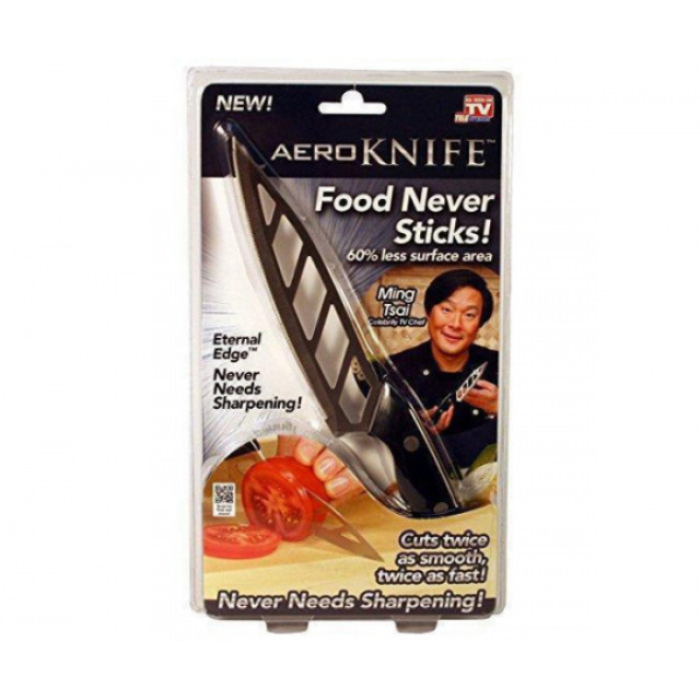 Надоело бороться с тупым ножом, который едва режит? Представляем Aeroknife, Аэро нож, лезвия которого всегда остаются острым. Этот универсальный кухонный нож предназначен для удобной и быстрой нарезки продуктов, который сделает процесс готовки более приятным.Секрет в аэродинамическом дизайне ножа, который создает меньше трения, когда Вы его используете, поэтому продукты не прилипают! Это делает Aeroknife самый простым и удобным ножом для нарезки в Вашем кухонном ящике. Aeroknife отлично справляется с нарезкой филе, даже лучше, чем любой другой специальный нож. Он даже прорезает свежевыпеченный хлеб! Предлагаемый нож настолько универсальный и простой в использовании, что станет отличным вариантом и альтернативой для нарезки всех продуктов. После первого использования, нож будет единственным, который Вы захотите использовать снова и снова! Нож изготовлен из нержавеющей стали. Качественный материал изделия позволяет использовать нож долгое время. Лезвие ножа никогда не нуждается в заточке. Удобная эргономичная ручка подарит удобное использование и легкость при нарезке ломтиков продуктов. Преимущества: Еда никогда не прилипает к ножу. Супер острый. На 60% меньше площади, чем поверхность обычного ножа. Легкий и простой в использование Эргономичная ручка Подходит для разных видов сырых и готовых продуктов. Благодаря отверстиям на поверхности ножа, еда не станет прилипать к прибору. Это обеспечивает быструю нарезку овощей или фруктов. С помощью Aeroknife Вы сможете подготавливать продукты к дальнейшей готовке, а также резать и крошить уже готовый и горячие блюда. Аэродинамический режущий инструмент имеет острое как бритва лезвие, которое не требует заточки! С помощью ножа Вы сможете в два раза быстрее нарезать мясо, хлеб, фрукты и овощи с большей точностью и меньшим усилием. Универсальность и прочность ножа позволяют сэкономить время на резку продуктов питания. Такой нож может стать отличным подарком для каждой хозяйки.Размер упаковки: 26*16*3 см.