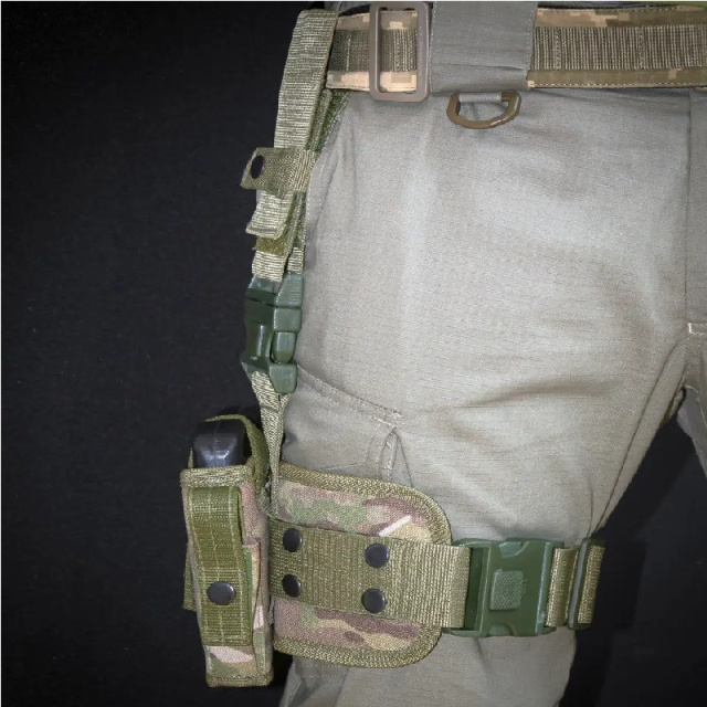 Оснащена двумя надежными пластиковыми фастексами. Крепится на бедро и дополнительно пропускается через ремень на штанах.
