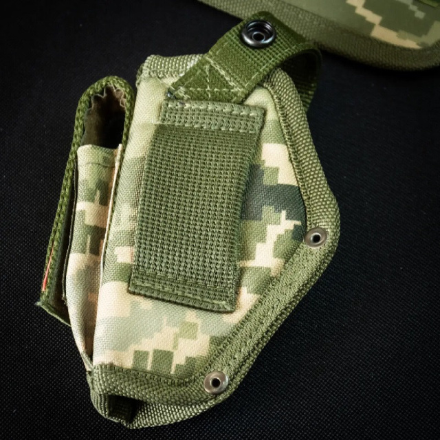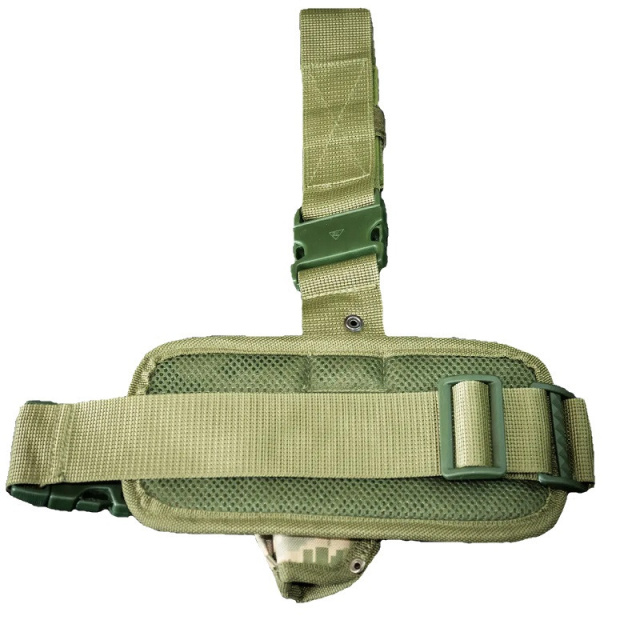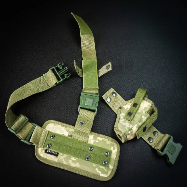 Имеет бедренный и поясной ремни. Крепление платформы кнопками и липучкой способствует удобству при разборе и жесткости общей конструкции кобуры.
