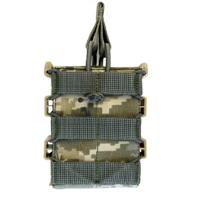 По всей высоте результата использован цельный прорезиненный жгут с фиксатором, благодаря чему магазин надежно обжимается и фиксируется внутри. Передняя стенка оснащена ременной лентой с отсеками для фиксации дополнительных элементов снаряжения.