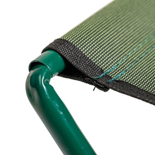 Довольно крепкий стул благодаря каркасу из стальных труб с полимерным покрытием зеленого цвета. Дополнительно предусмотрены снизу ремни, для более высокой нагрузки. На ровной поверхности выдерживает до 110 кг.