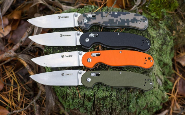 Рукоятка каждого ножа Ganzo 727m облицована накладками из стеклопластика G10. Это современный композитный материал с высокими показателями износостойкости и способностью выдерживать воздействие многих химически активных веществ. Для выбора доступны четыре цветовых варианта рукоятки: черный, оранжевый, болотно-зеленый и камуфляжный, независимо от цвета, поверхность будь рукоятки текстурирована, чтобы его можно было прочнее держать в руках. Кроме того, производители предусмотрительно разместили на рукоятке клипсу для крепления ножа на ремень и отверстие для протяжки темляка.