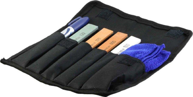 Всего с точилкой используется четыре бруска. Зернистость отражена числом на каждом из абразивных камней. Большее число означает мелкую зернистость, меньший, что зернистость крупнее и брусок более грубый. Когда клинок слишком затуплен или требуется перетачивание на другой угол – используем сначала брусок наибольшей зернистости (120 или 320 единиц). Затем очередь средней грубости – бруски с обозначением "600". Завершаем заточку наиболее деликатным – с надписью "1500". Простой правке и постоянной поддержке остроты достаточно брусков с показателями 600 и 1500.