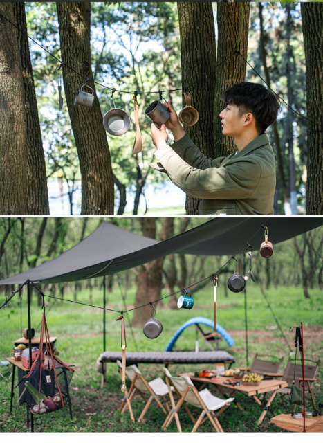Веревка предназначена для подвешивания различных мелких предметов, которые могут вам пригодиться во время пребывания на природе. В составе изделия - такие материалы, как полиэстер, нейлон, сплав алюминия. Цвет-темно-серый. Длина достигает 430 сантиметров. На веревке, например, можно зафиксировать всевозможные кухонные приборы, посуду, чашки. На веревке крепятся крючки, которые позволяют подвешивать необходимые вещи. Длина изделия регулируется.