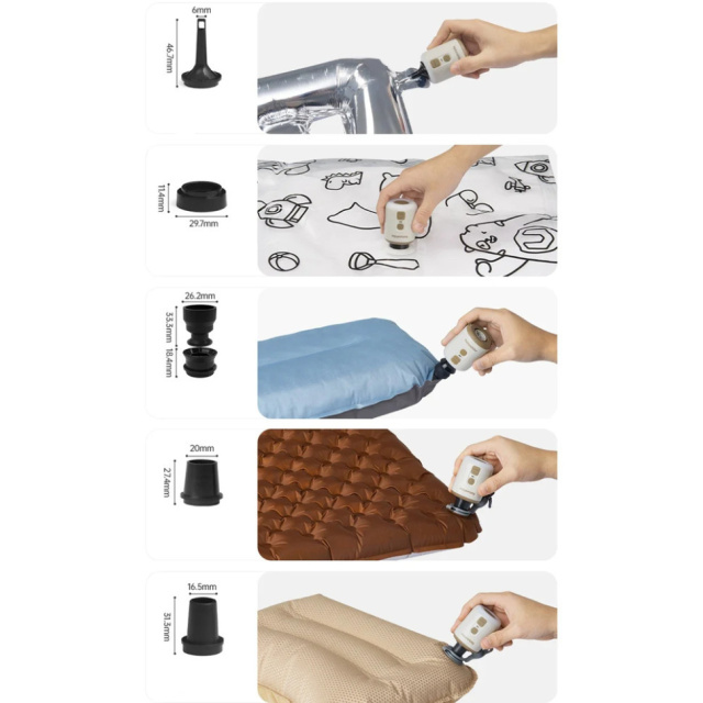 Насоси. Рабочее давление воздуха составляет 4.5 кПа, а максимальная производительность — 180 л/мин, что позволяет надуть матрас примерно за 40 с или надувную подушку за 20 с. Комплектация дополнена набором из 5 насадок для комфортной эксплуатации.