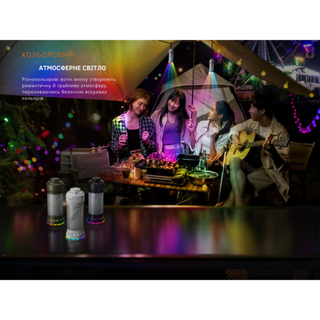 Модель укомплектована светодиодами COB, холодным белым диодом Redslight SC1818C и 12 диодами WS2812B-3535 – каждый со сроком службы не менее 50 тысяч часов. Разнообразие вариантов луча позволяет адаптировать свет под индивидуальные потребности: фонарь можно активировать в стандартном режиме освещения на 360° (цветная температура 3000К) или с направленным книзу лучом (6500К), комбинировать эти режимы для достижение максимальной освещенности или включать цветную подсветку, создавая уютную атмосферу дома или на природе.