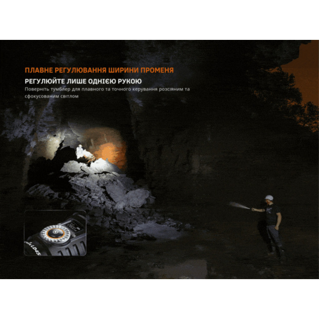 Одна из главных особенностей модели — цифровой зум с плавной регулировкой ширины луча с помощью вращающегося переключателя. Достаточно повернуть его на 270°, чтобы переключиться с заливного освещения прожектора на сфокусированный луч дальнобойностью 480 м.