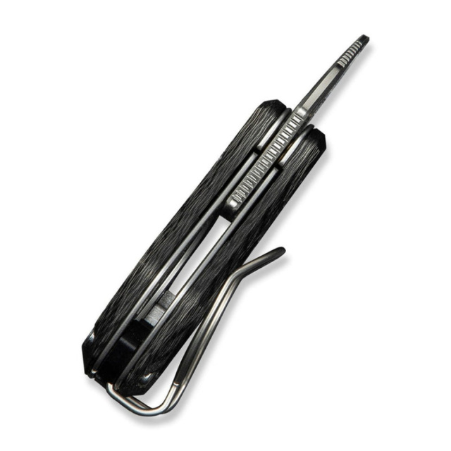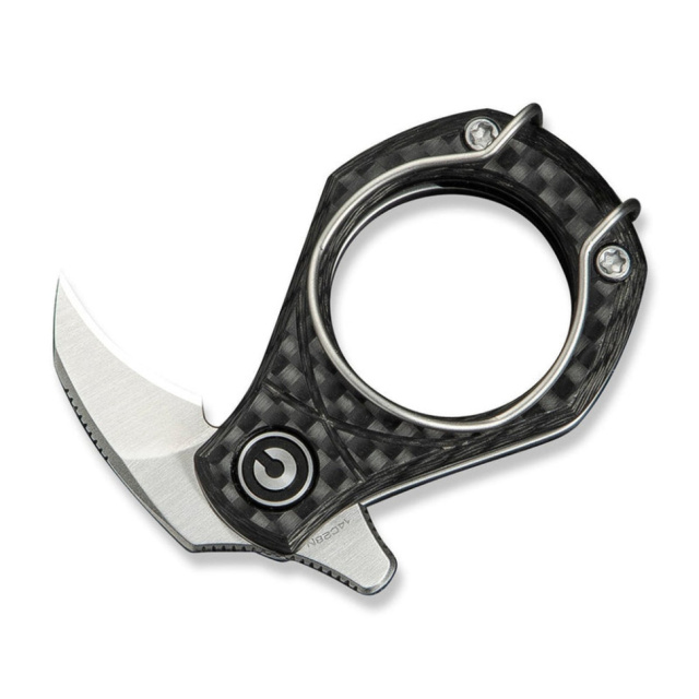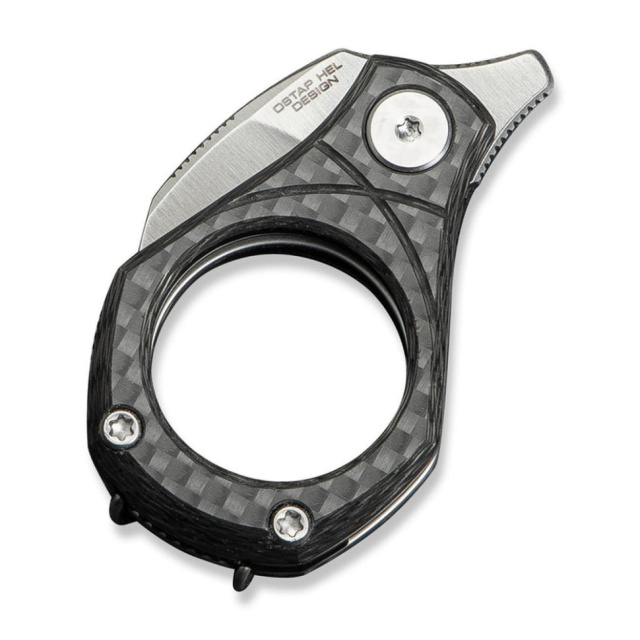 Несмотря на миниатюрные размеры (всего 57,4 мм в закрытом положении), модель не лишена эргономики, за которую отвечают шероховатые накладки из карбона на рукояти. В конструкции также есть клипса на карман, который можно использовать как зажим для денежных купюр или кольцо для ношения ножа в качестве брелока.