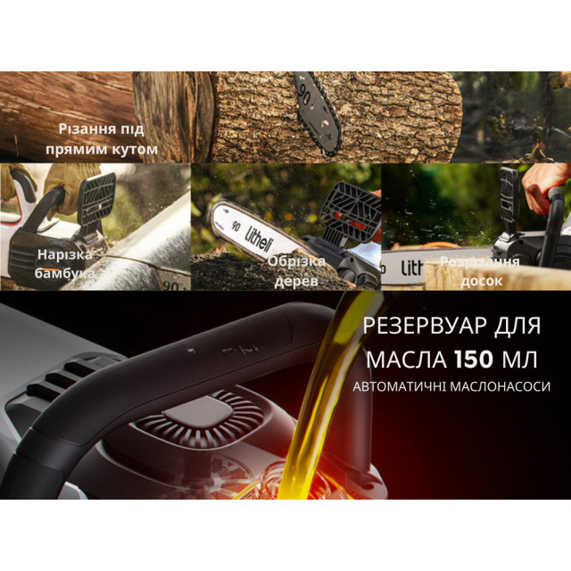 Пила Litheli оснащена масляным баком объемом 150 мл с функцией автоматической смазки цепи. Прозрачное окошко сбоку конструкции позволяет контролировать уровень масла для своевременного обслуживания.