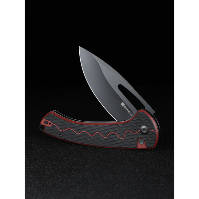 Sencut Squiggy открывается двумя способами: с помощью флиппера или овального отверстия в клинке. За фиксацию отвечает кнопочный механизм Button Lock с пружинным сопротивлением.