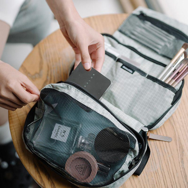 Внутри косметички есть три отделения: пара сетчатых карманов и одно отделение с водонепроницаемой пропиткой для разделения сухих и влажных принадлежностей.