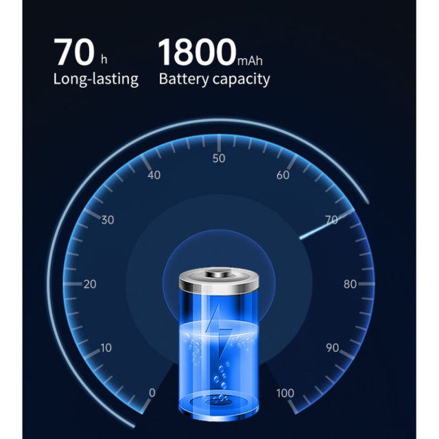 70 ч работы на одном заряде. Фонарь питается от встроенного аккумулятора 1800 мАч (3.7 В) и оснащен зарядным портом USB-C в нижней части корпуса. Процесс зарядки длится 2.5 ч. Боковой индикатор отображает статус элемента питания.