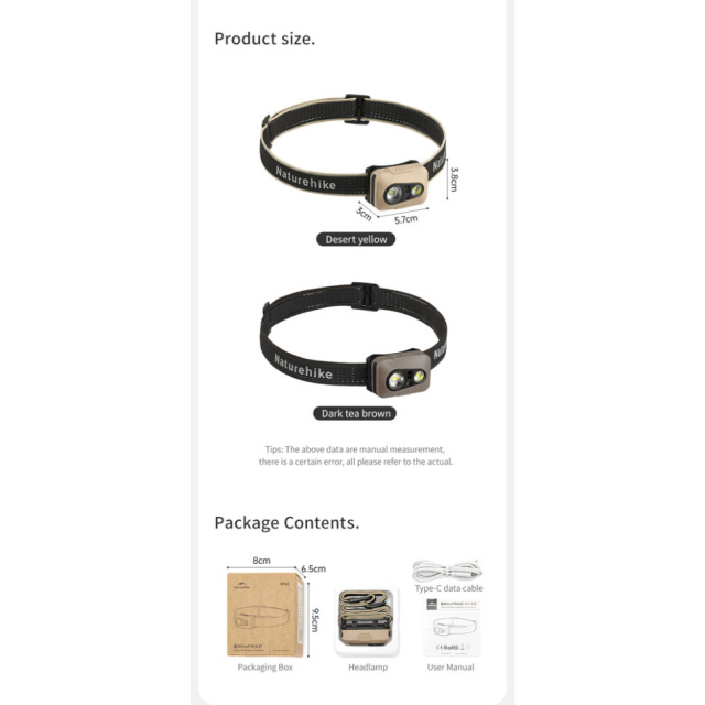 Фонарь Naturehike CNK2450ZM015 с налобной резинкой, зарядный кабель Type-C, инструкция пользователя.