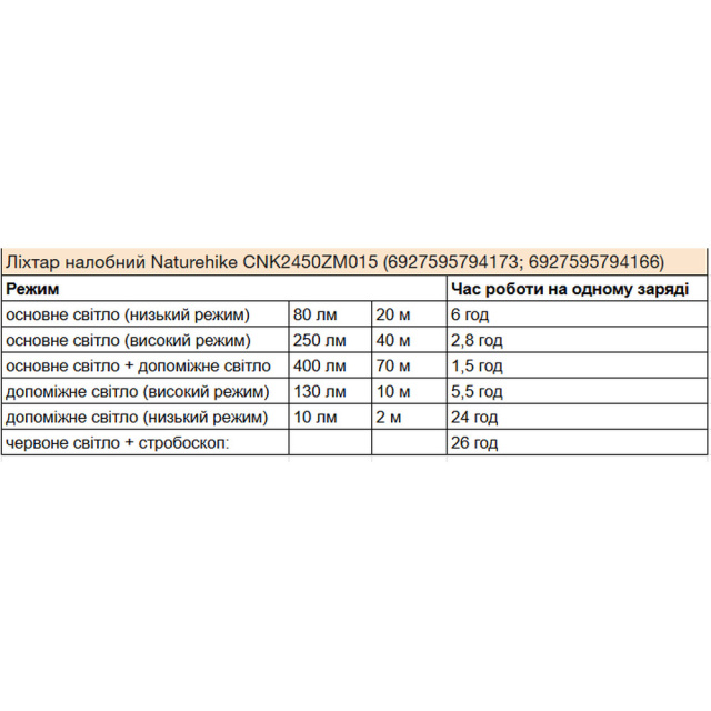 4 основных режима. Параметры белых режимов: 400 лм/1.5 ч, 250 лм/2.8 ч, 130 лм/5.5 ч. В красном режиме фонарь работает в течение 26 ч на одном заряде.