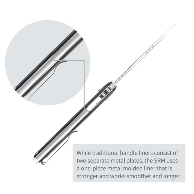Замок Crossbar Lock закрывает клинок поперечным упругим штифтом и одинаково удобно управляется как правой, так и левой рукой. В фирменной модификации от SRM замок рассчитан на однопальцевую разблокировку с любой стороны рукояти, отличающую механизм от многих аналогов.