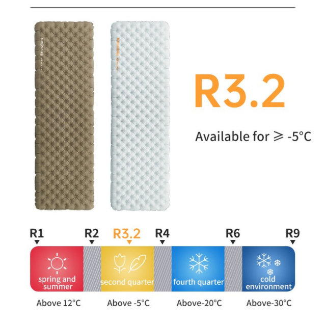 Рейтинг R-Value 3.2 предусматривает использование изделия при температуре до -5°C, что делает его пригодным для трех- и даже четырехсезонного применения. Матрас эффективно изолирует тело от холодного грунта и сохраняет тепло на протяжении всей ночи.