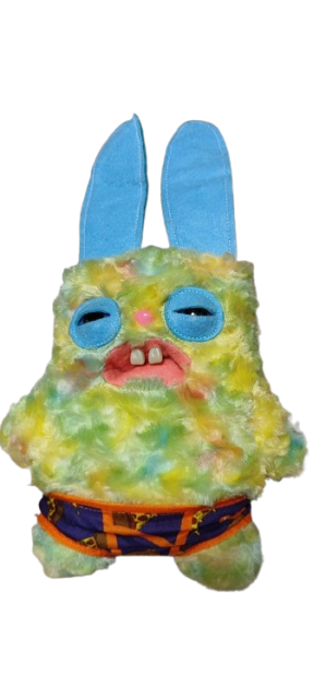 Игрушка выполнена из мягкого плюша , украшена большими голубыми глазами и милыми выступающими зубками — выглядит очень забавно и привлекает внимание. На ней яркие разноцветные трусики с принтом. Отлично подойдёт как для игры, так и для декора детской комнаты или коллекции необычных игрушек.