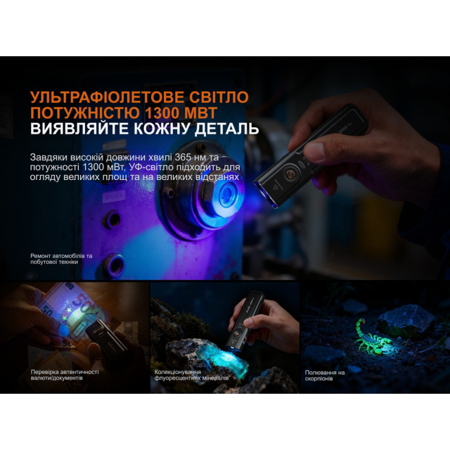 Fenix E06R PRO питается от встроенного Li-ion аккумулятора 1650 мАч. Зарядка осуществляется через порт USB Type-C, расположенный под защитной крышкой.