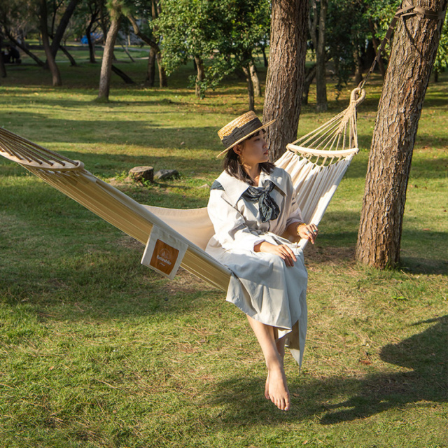 Планки из натуральной древесины равномерно распределяют нагрузку по всей длине полотна. Их изогнутая форма предотвращает перекручивание гамака, а красивая текстура придает изделию стильный вид.