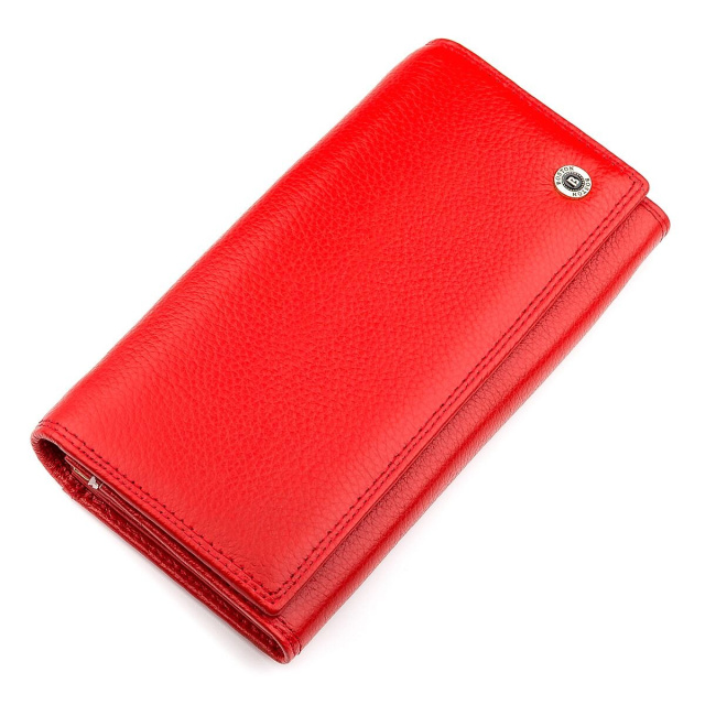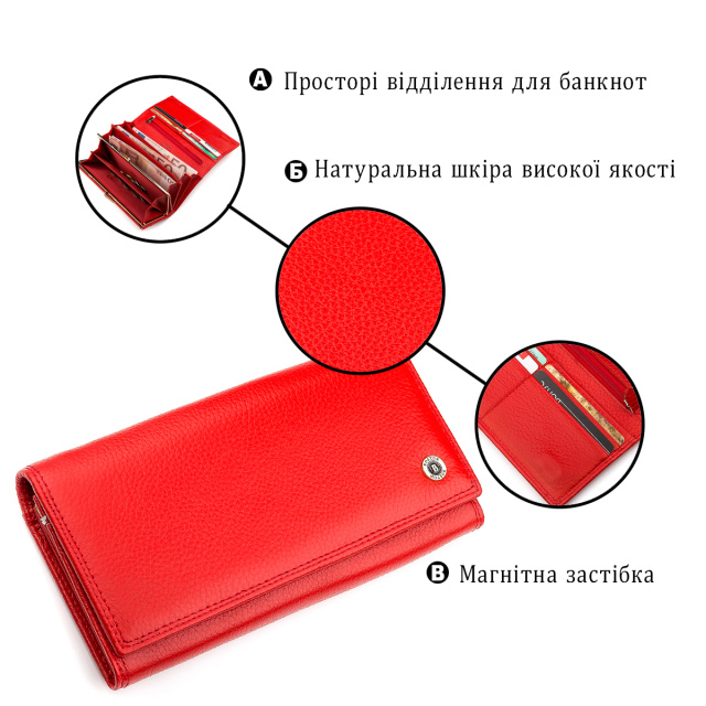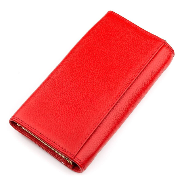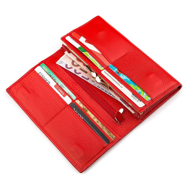 Современная модель кошелька представлена удобной и надежной фиксацией на магнитах, изготавливается исключительно из натуральной, прочной кожи, а красный цвет очень понравится девушкам и женщинам. Внутри достаточно места для бумажных купюр, есть секции для платежных карт, а также большая монетница. Снаружи имеется широкий кармашек, а на лицевой стороне нанесена фирменная двойная строчка со значком бренда золотистого цвета. Упаковка также привлекательная, что позволит подарить кошелек друзьям и близким на любой праздник.