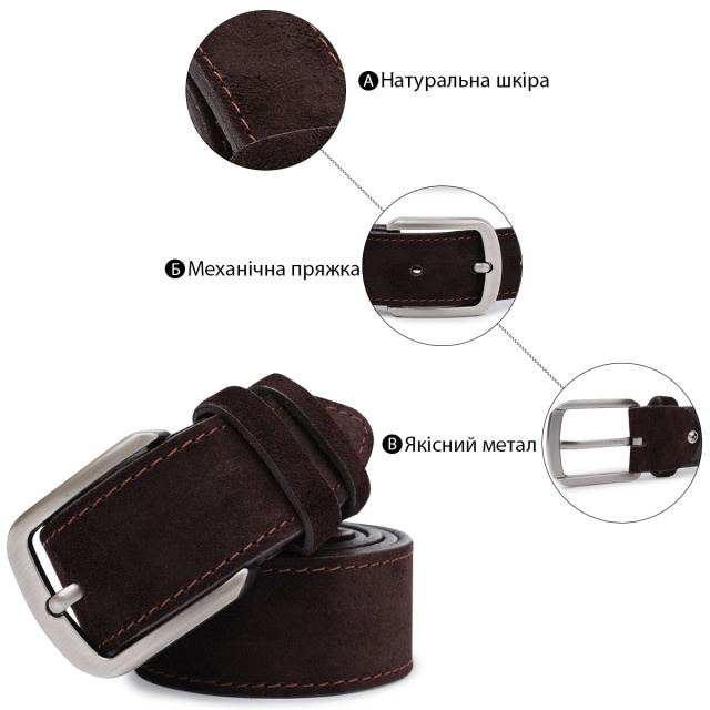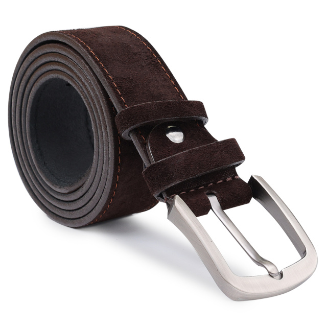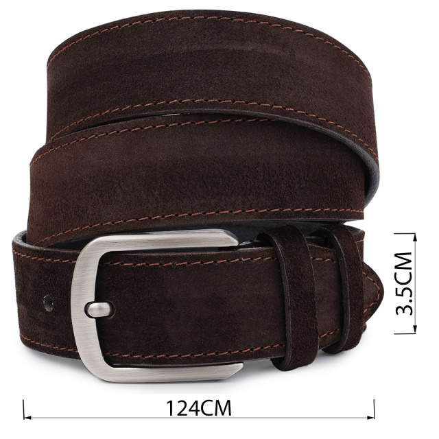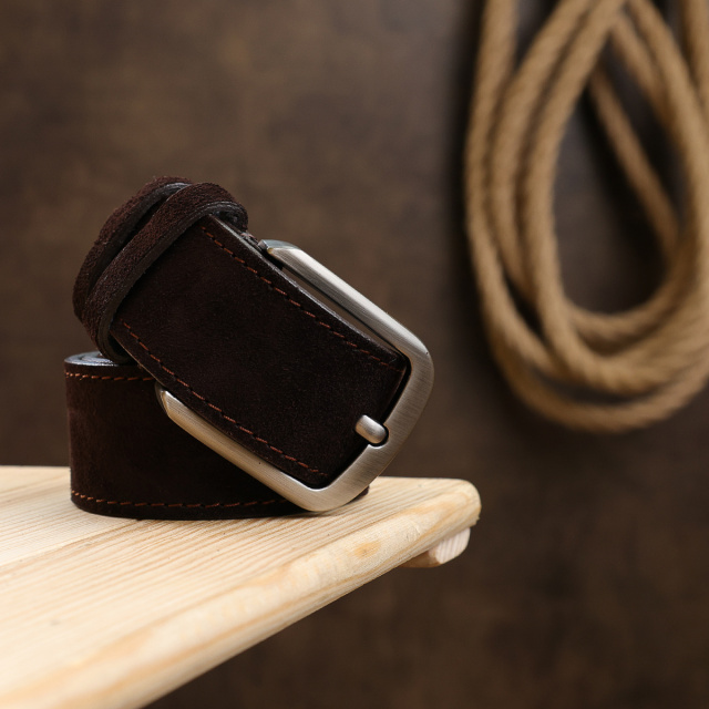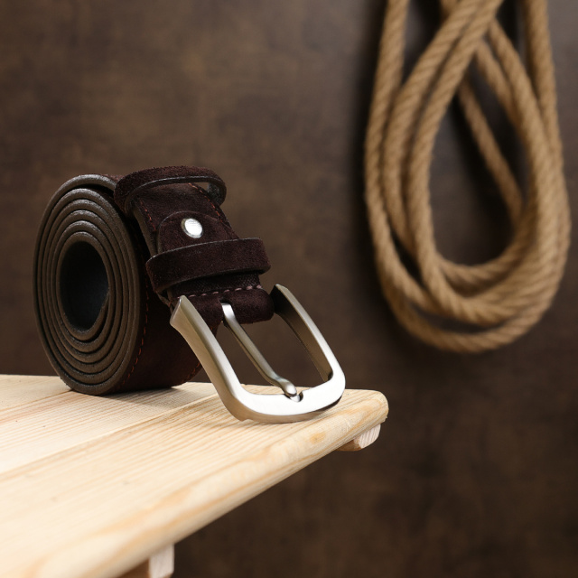 Стильный и практичный мужской замшевый ремень, который станет Вам просто незаменимым аксессуаром в гардеробе. Выполнен из натуральной высококлассной кожи с повышенной прочностью. Пряжка изделия – классическая, фактура – приятная на ощупь, а цвет - насыщенный шоколадный.